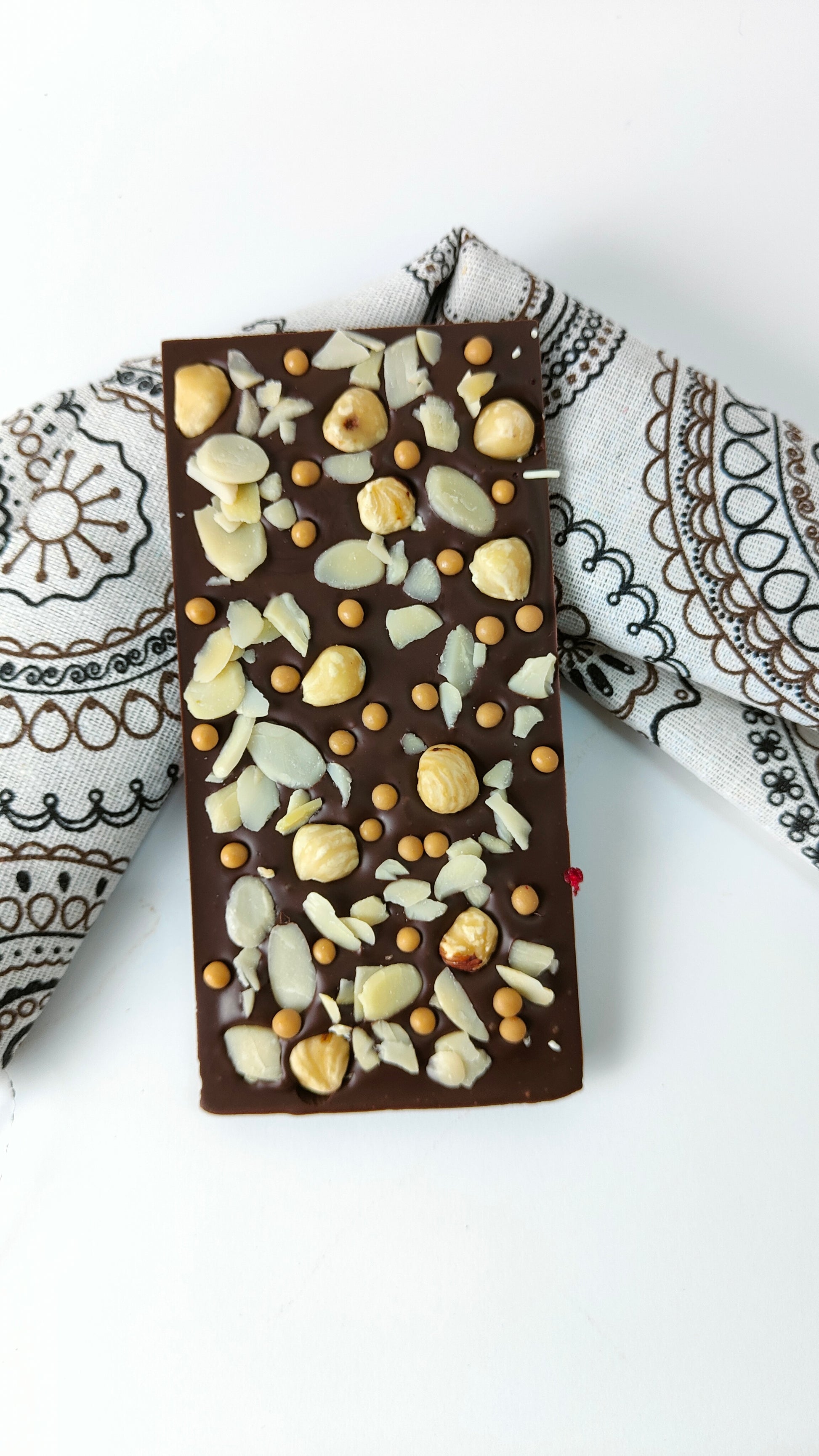 Uma experiência sensorial única: a intensidade do chocolate negro encontra a riqueza das avelãs e amêndoas torradas, enquanto os crocantes de caramelo salgado trazem um contraste irresistível entre o doce e o salgado. Cada quadrado é um convite à indulgência, equilibrando textura, sabor e sofisticação.