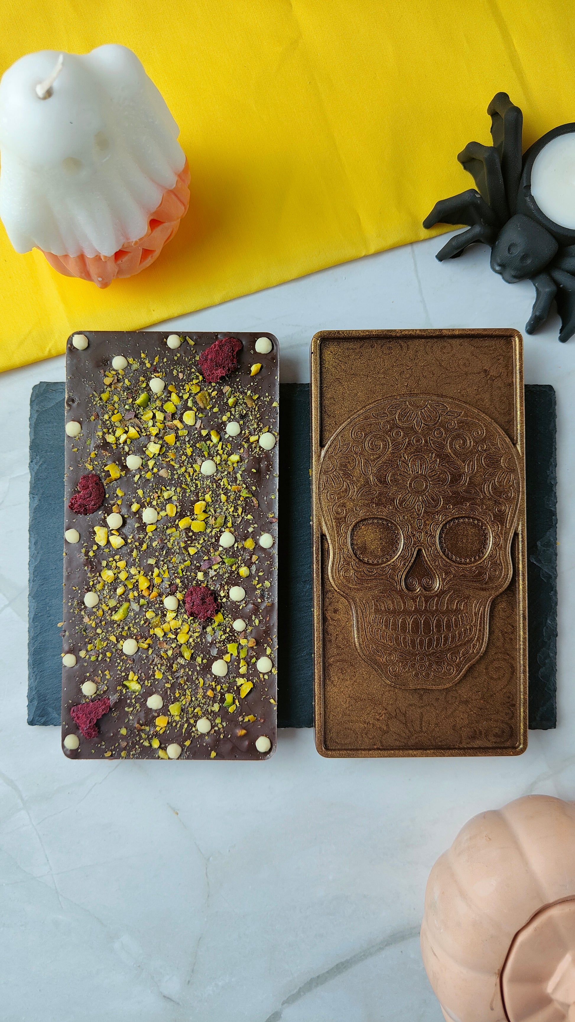 A nossa tablete caveira de chocolate negro é decorada com inclusões cuidadas de pistáchios crocantes, framboesas e morangos liofilizados intensamente frutados, e pequenos pedaços de chocolate branco estaladiço, que criam uma explosão de contrastes em cada dentada.