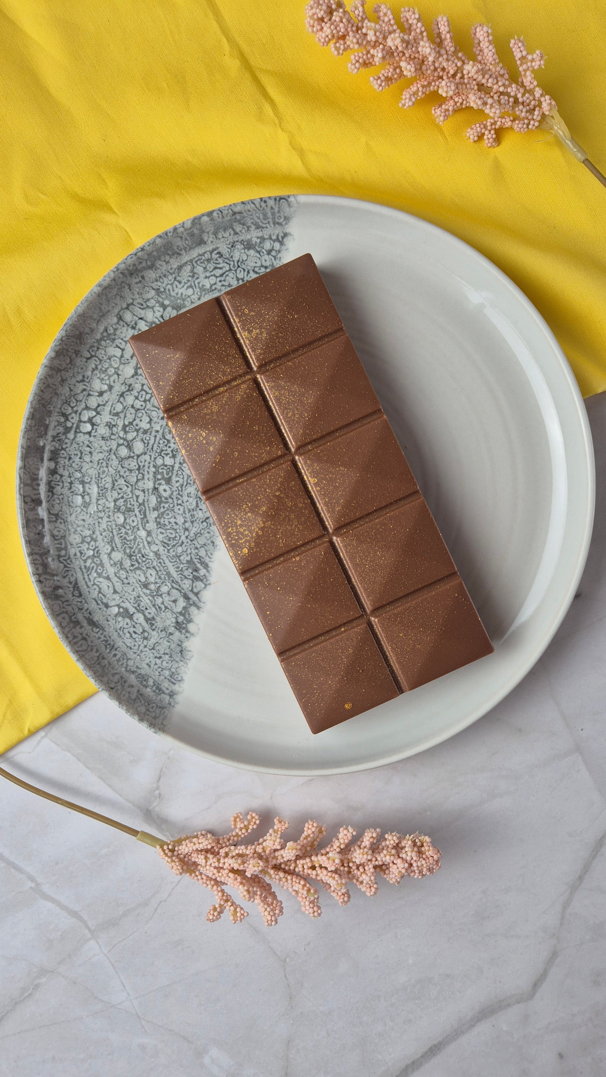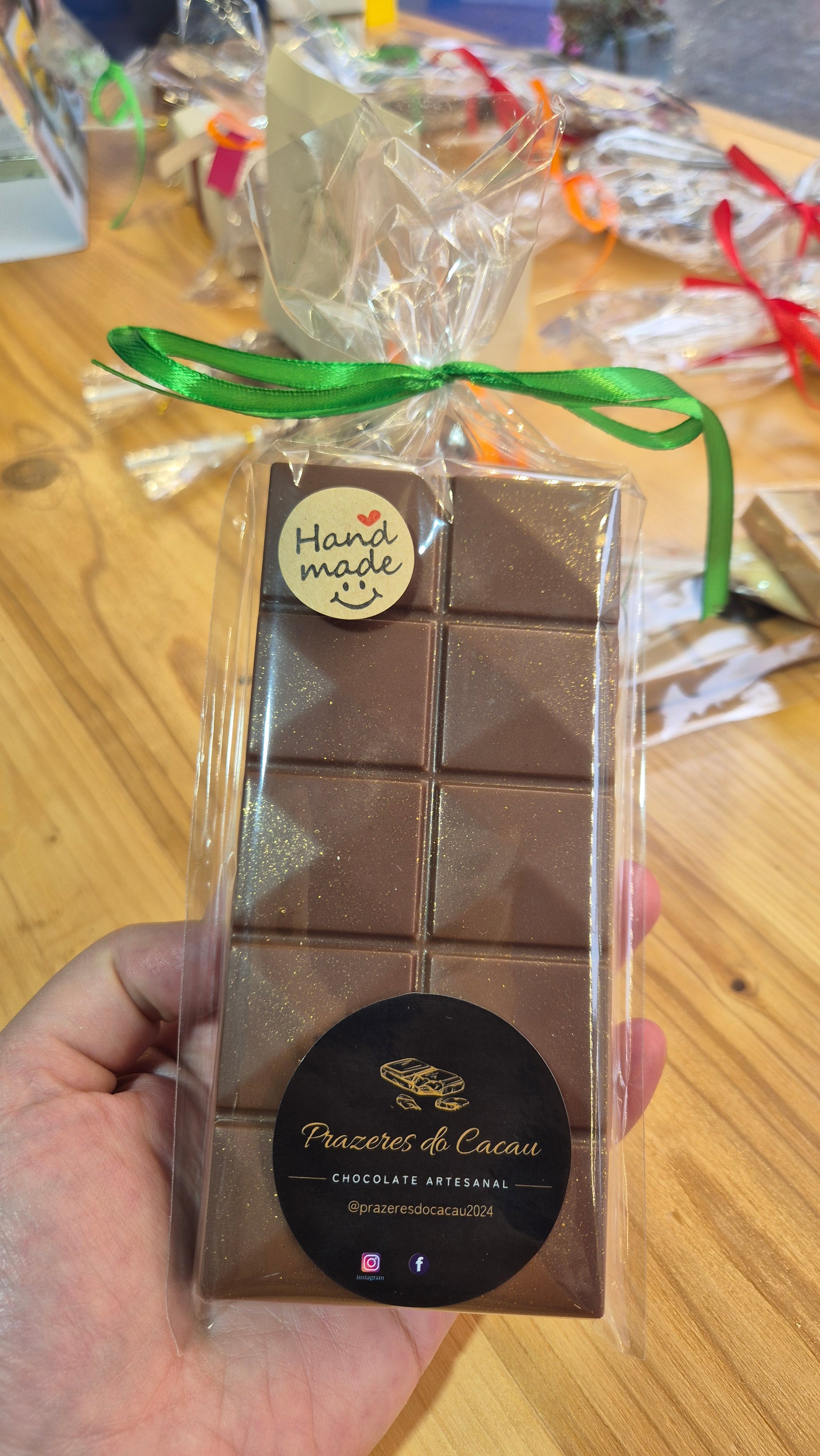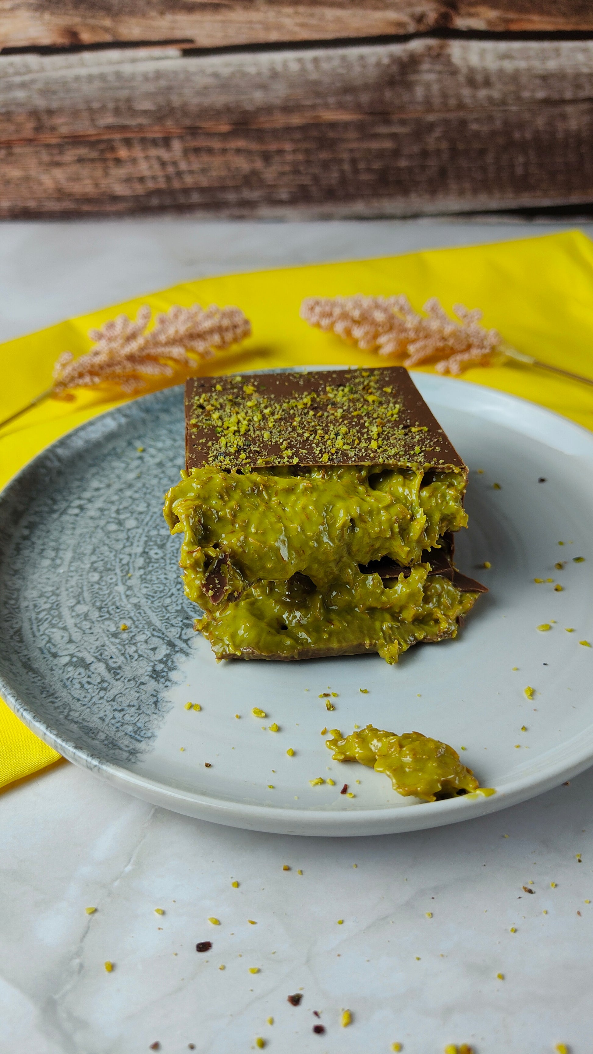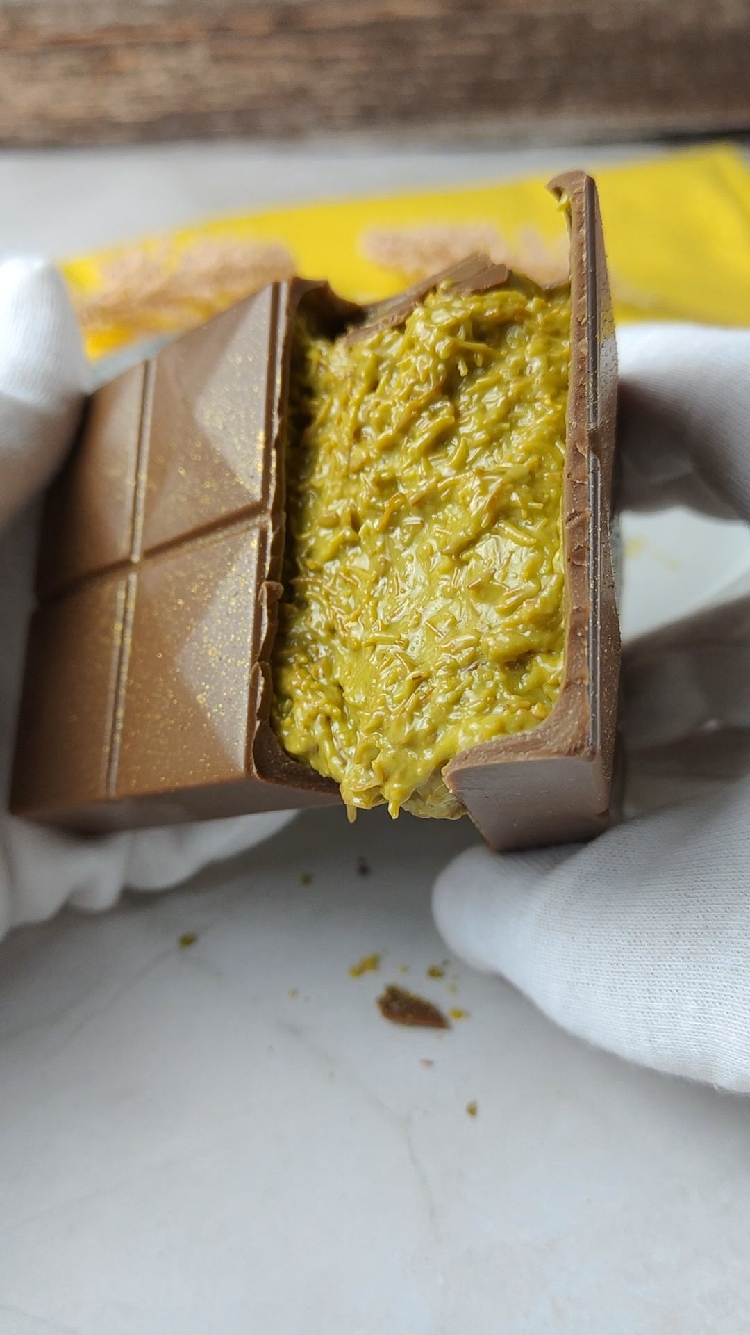 Tablete de chocolate Dubai com casquinha de chocolate de leite com recheio de pasta pura de pistacho iraniano com massa crocante Kataifi e chocolate branco.