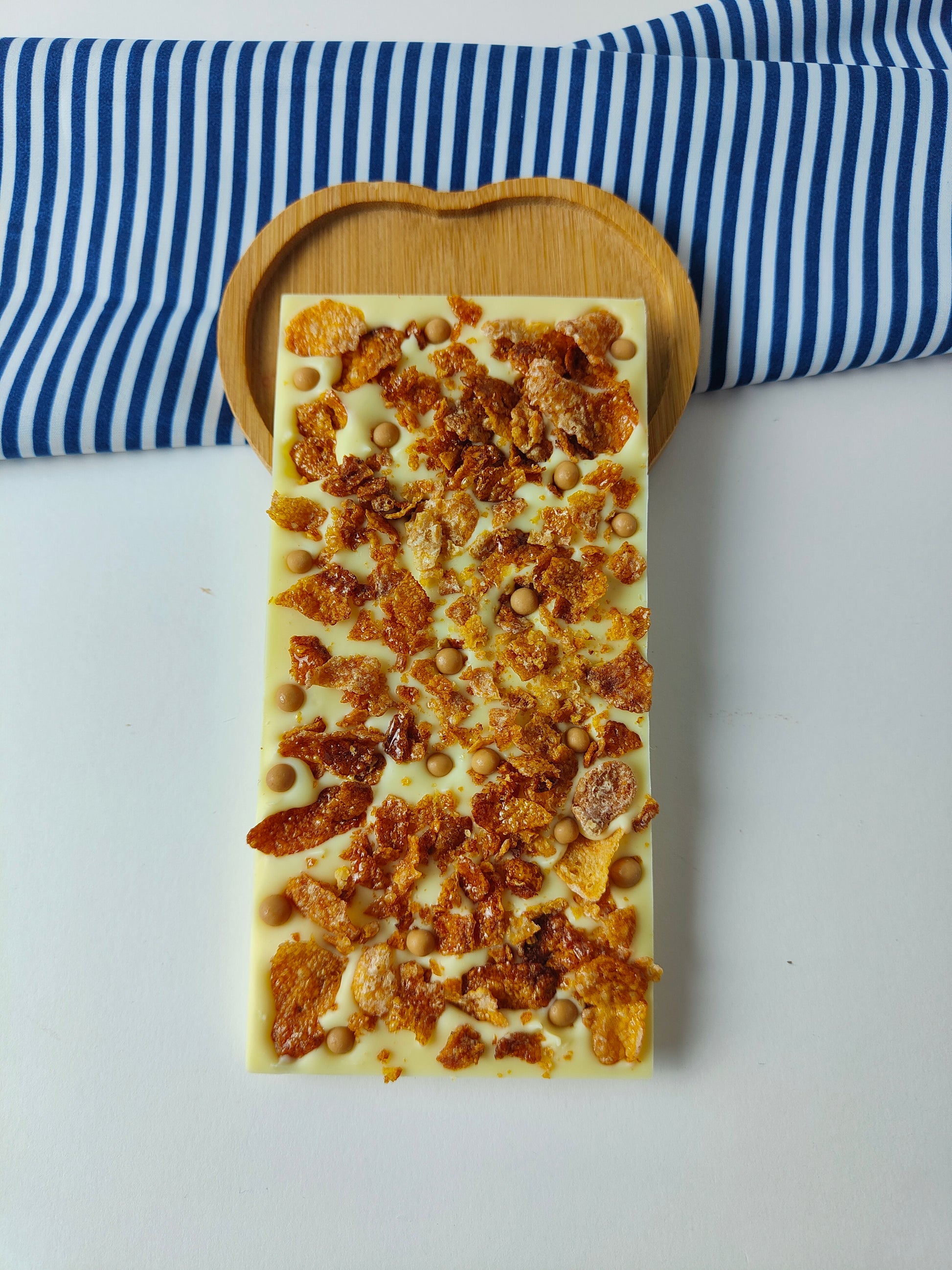 Uma tablete que junta o melhor dos contrastes: a doçura aveludada do chocolate branco caramelizado, a crocância leve dos flocos de milho e o toque surpreendente dos crocantes de caramelo salgado. Um verdadeiro convite à textura e ao sabor, capaz de transformar cada quadradinho numa experiência irresistível.