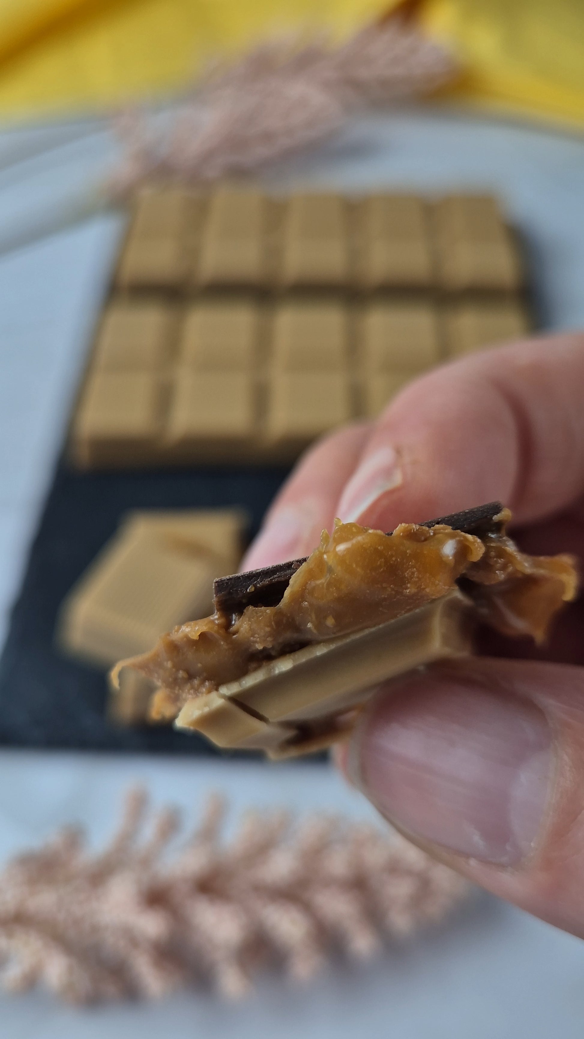 A nossa tablete artesanal de caramelo e amendoim combina o melhor do chocolate com recheios feitos à mão, inspirados nos clássicos que nos fazem sorrir.