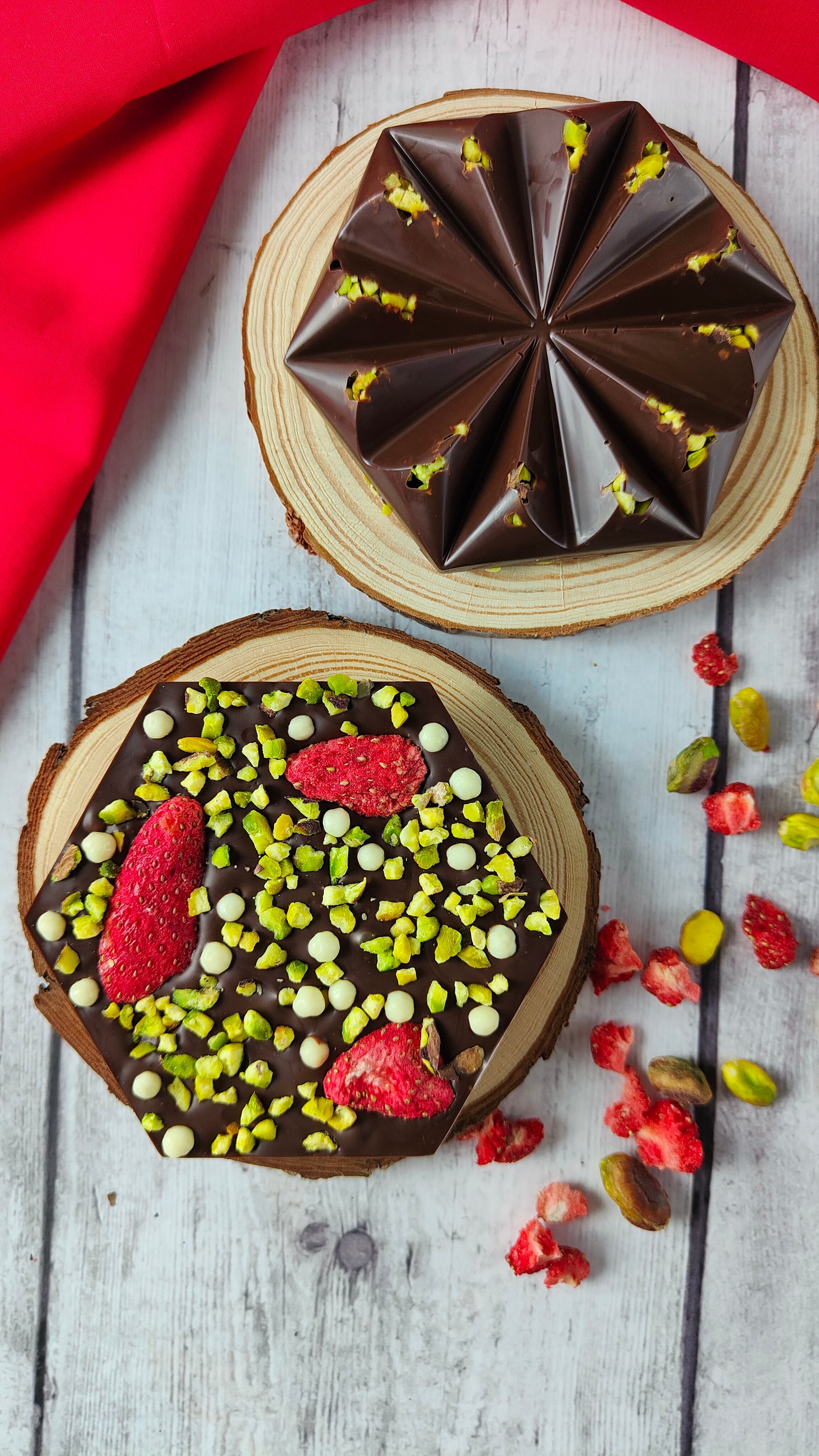 O resultado? Um equilíbrio entre o amargo suave do chocolate negro, a frescura ácida do morango e a doçura subtil do chocolate branco, com o toque tostado e elegante dos pistáchios.