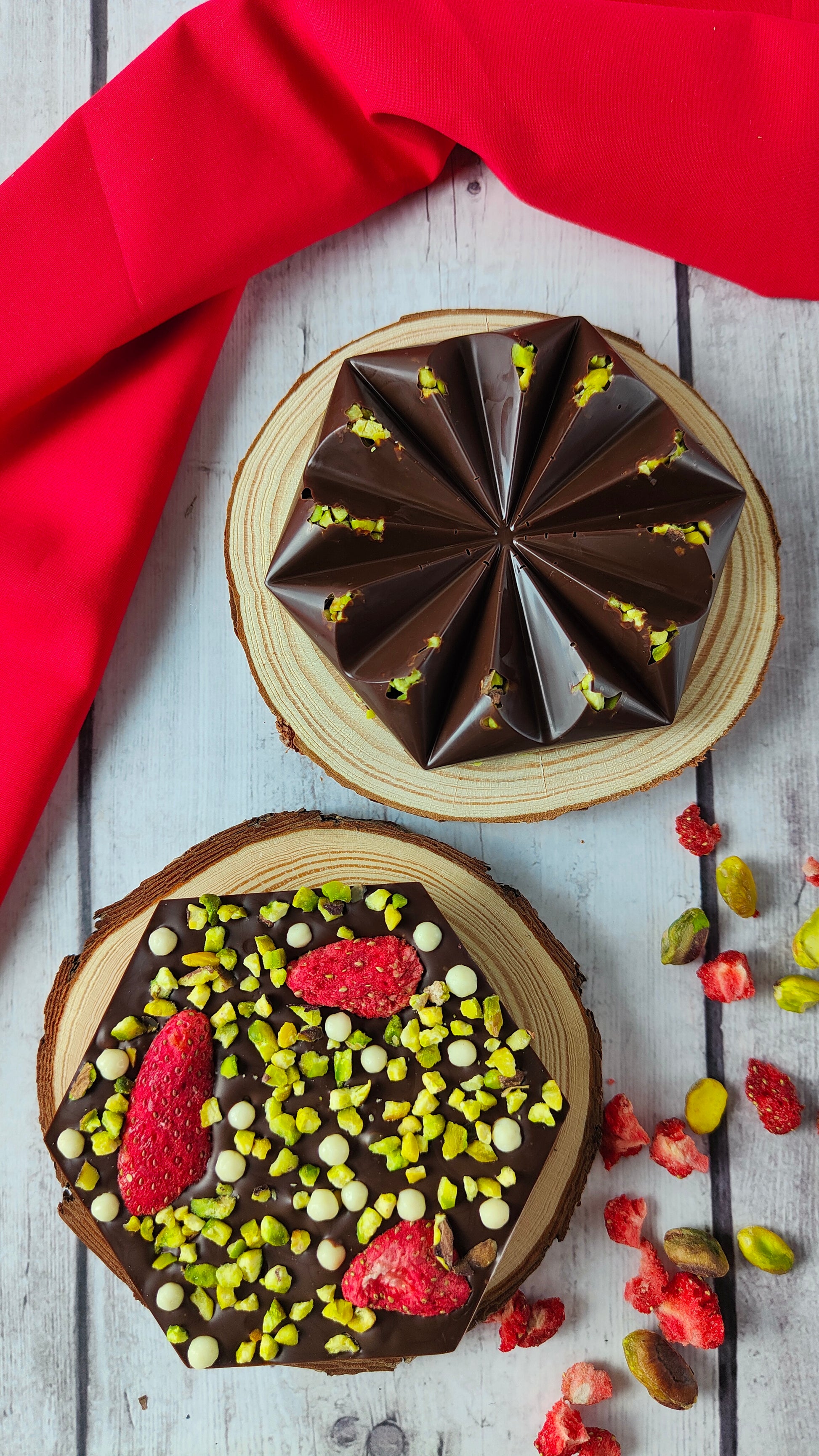A nossa tablete Ruby de chocolate negro é decorada com inclusões cuidadas de pistáchios crocantes, morangos liofilizados intensamente frutados, e pequenos pedaços de chocolate branco estaladiço, que criam uma explosão de contrastes em cada dentada.